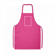 Delantales para publicidad estampados. Lo primero está confeccionado en tejido de algodón y poliéster y disponible en una variada gama de colores. También lleva una cinta para ajustarlo en la cintura y en el cuello.