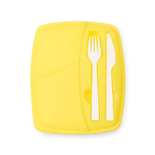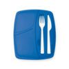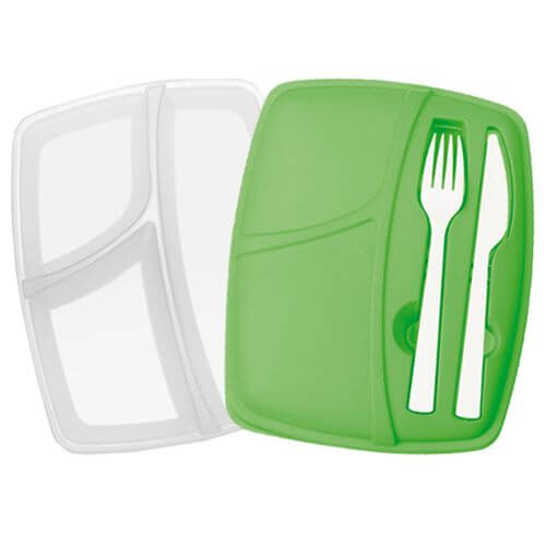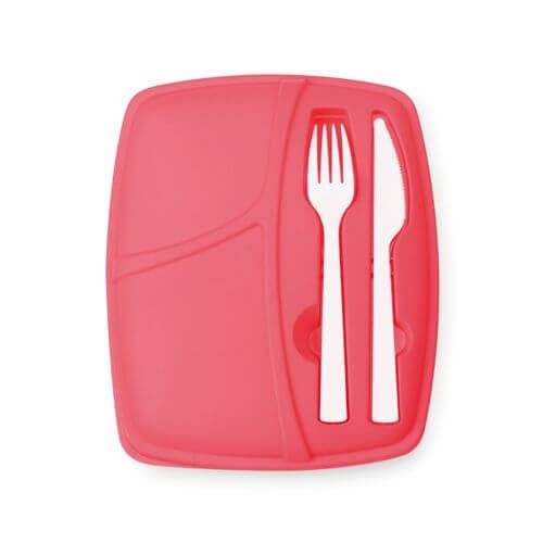 Fiambrera, con dos compartimentos interiores. Cuerpo translúcido y tapadera porta-cubiertos (tenedor y cuchillo incluidos). Además tiene una capacidad de 800 ml. y es apta para lavavajillas. Material PP, en variada gama de colores.