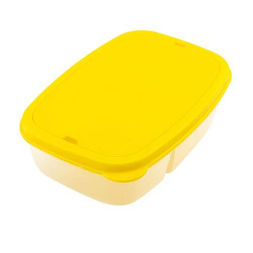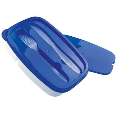 Fiambrera de 1000 ml. de capacidad en material de PP. Con dos compartimentos y tapadera porta-cubiertos, cuchillo y tenedor. Disponible en tres colores distintos. Y por último, apto para congelador, microondas y lavavajillas. Por lo general marcaje en tinta.