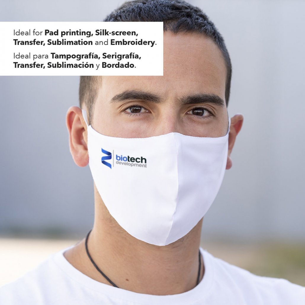 Mascarilla higiénica reutilizable con doble capa, hecha en material antibacteriano e hidrófugo. Capa exterior 100% poliéster y capa interior en material técnico. Por lo general marcaje en tinta.
