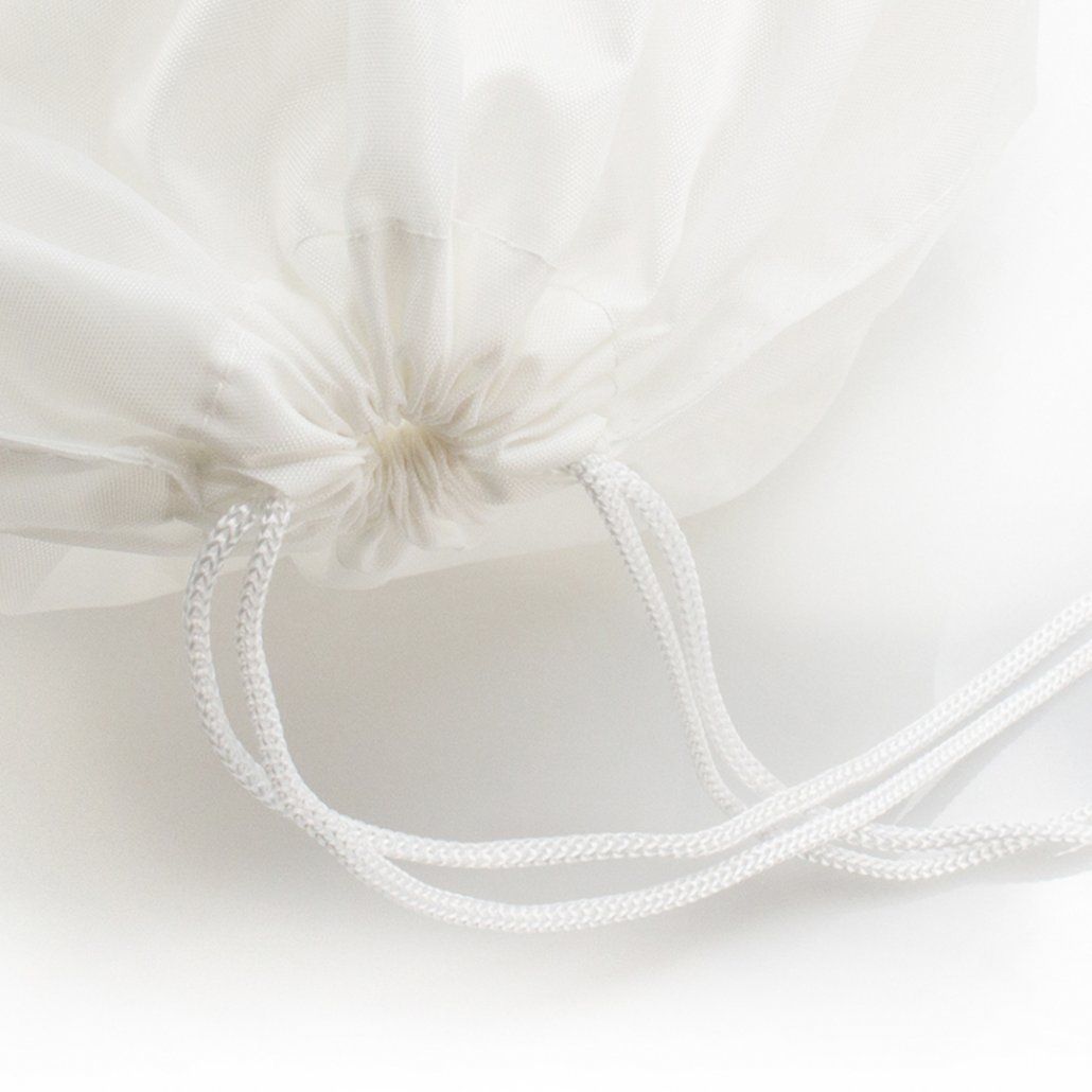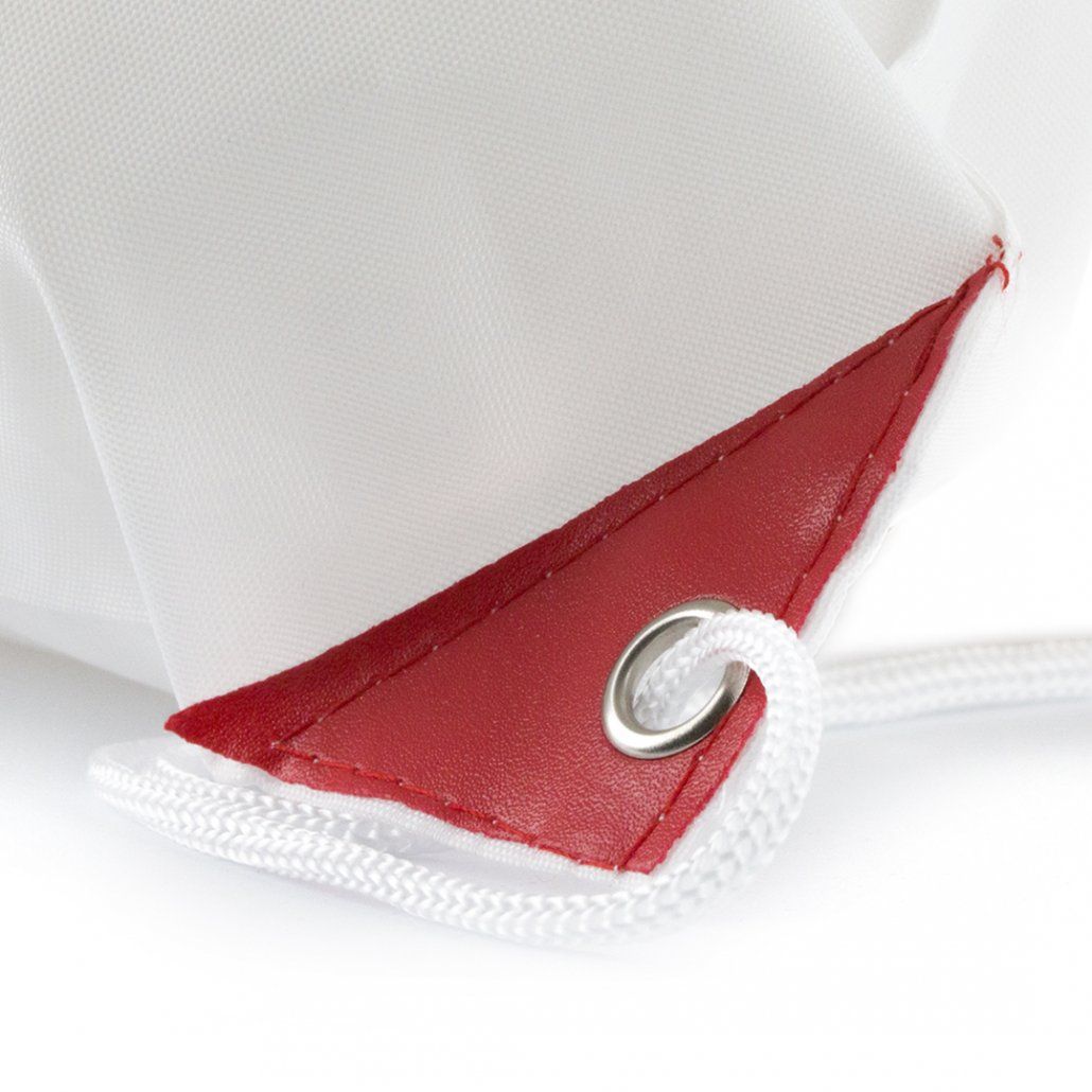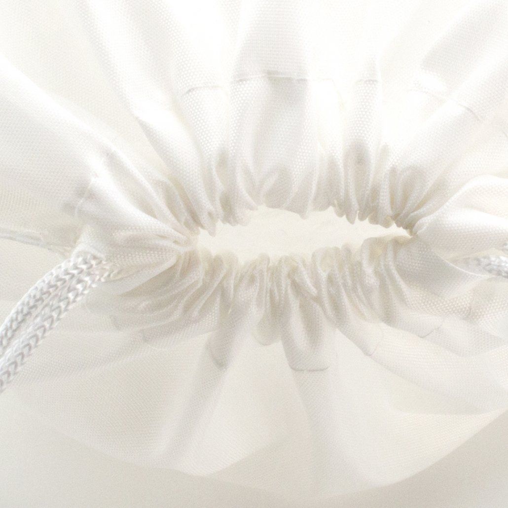 Mochilas marcadas, blanca de cuerdas, en suave poliéster 210T. Las esquinas llevan un refuerzo de polipiel en alegres colores, además de argollas metálicas, con cuerdas auto-cierre en color blanco. Especialmente diseñada para marcaje en sublimación.