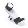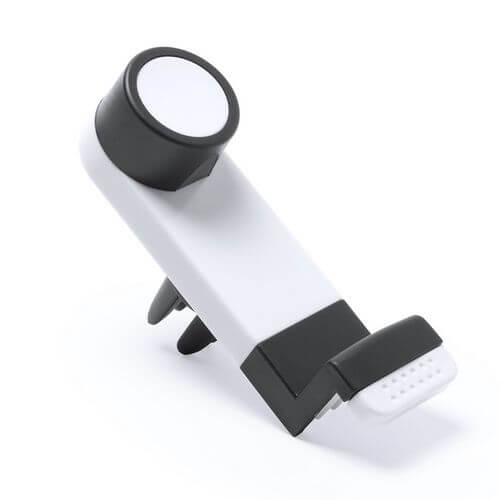 Soporte smartphone de diseño minimalista y elegante acabado bicolor en blanco y negro. Con sistema de fijación para rejilla de ventilación del automóvil y pastilla circular frontal.