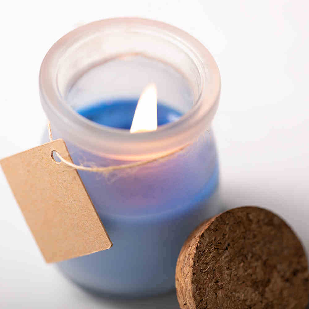 Vela aromática en tarro de vidrio. Con tapón de corcho y etiqueta de cartón reciclado para escribir mensaje. Además, disponible en tres colores distintos, azul, blanco y rojo, presentada en caja individual. Por lo general marcaje en tinta.